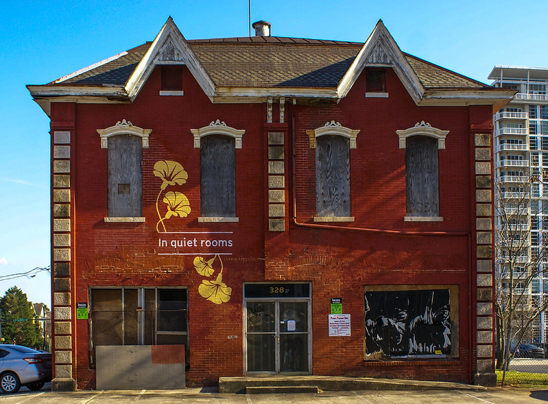 Continuing our mini-series, of photos featuring yellow; today we share this photo of yellow flowers and the poetic phrase “in quiet rooms”. This scene is part of an art project called Wall Poems of Charlotte. The project helps bring poetry into everyday spaces such as this abandoned building in uptown Charlotte.