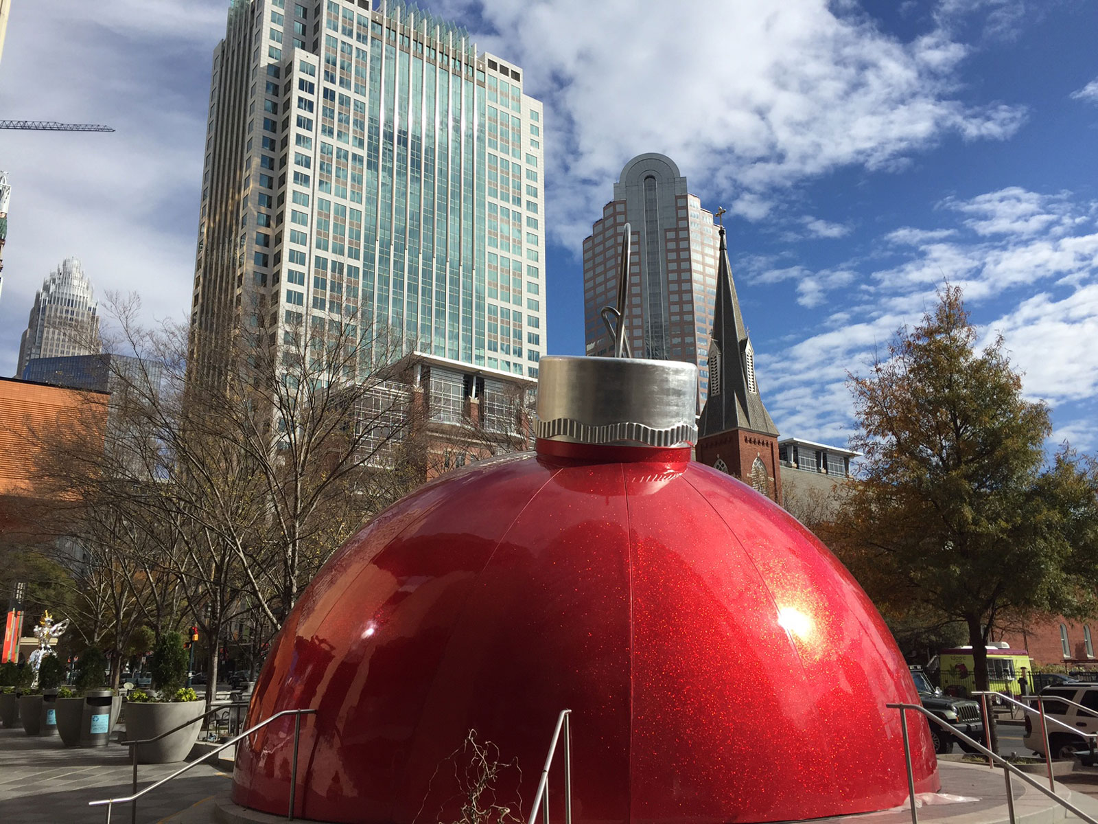 Today we feature a large Christmas ornament in Uptown Charlotte. Other interesting aspects of the photo include One Wells Fargo, Three Wells Fargo, and the Bank of America Center. Also, the photo includes construction crane, one of many in Uptown.