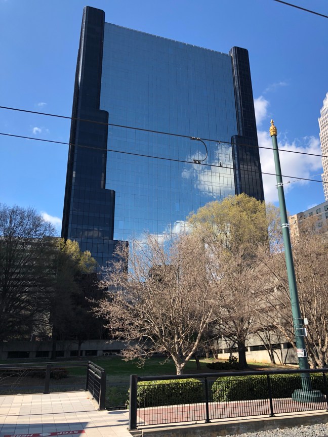 The Charlotte Plaza stands out against blue sky. I especially like the cloud reflection which blends nicely with the cloud behind the building.