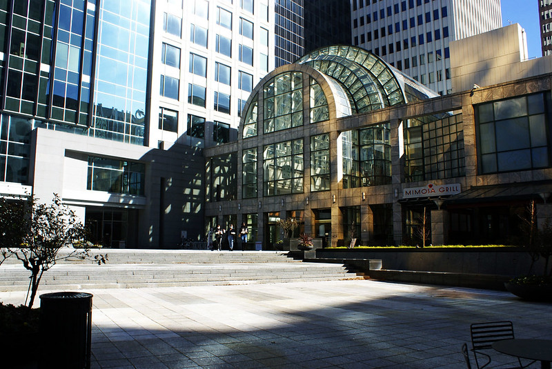 Today’s photo is another example of contrasting light and shadow. This time in the Two Wells Fargo Center (2WFC) plaza. Look closely and you will see three people leaving the Atrium.