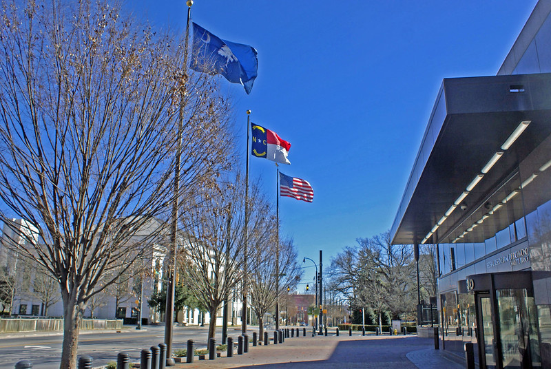 I took this photo because it includes the South Carolina and the North Carolina flags as well as the US flag. The reason for three flags is because the building is The Federal Reserve Bank, Charlotte Branch. It is a regional center for the Carolinas as a result both flags are flown.