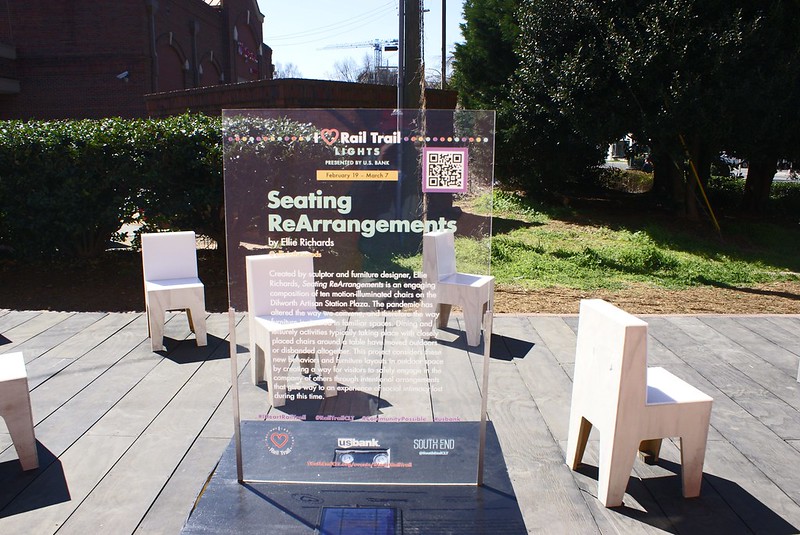 Today’s photo shows an art display called Seating ReArrangements. The art was created by Ellie Richards and the sign says “Seating ReArrangements is an engaging composition of ten motion-illuminated chairs on the Dilworth Artisan Station Plaza. Viewable from the Rail Trail, visitors will be invited by rotating colors of embedded LED lights within plywood chairs to this socially-distanced seating arrangement”.