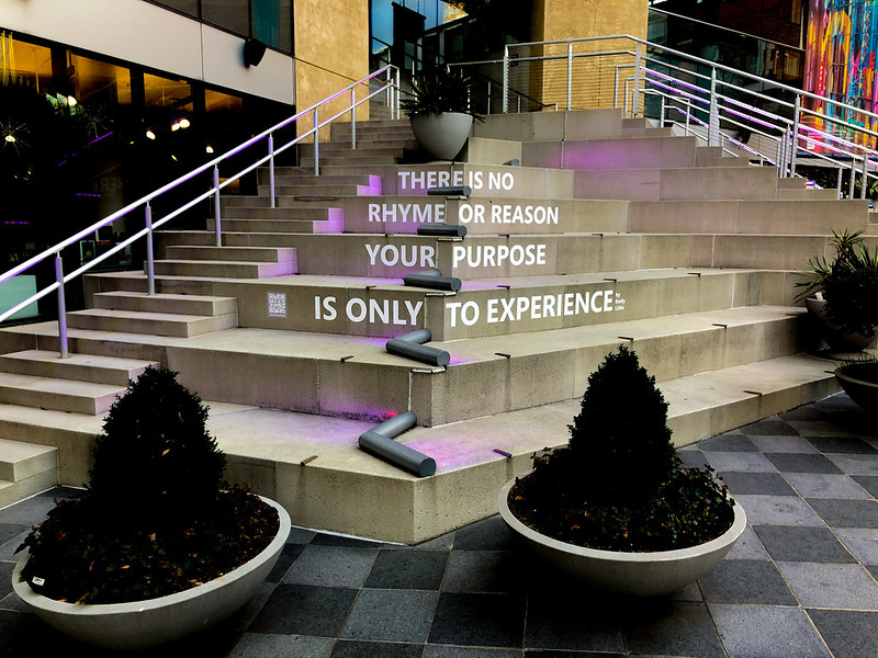 A block of seesaws at the the Impulse exhibit as part of the Shout festival in uptown Charlotte. The seesaws are a hit and much enjoyed by the young and the old. The website, for Impulse exhibit, explains that “an interactive work comprising a series of 15 seesaws with light and sound that changes when in motion”.