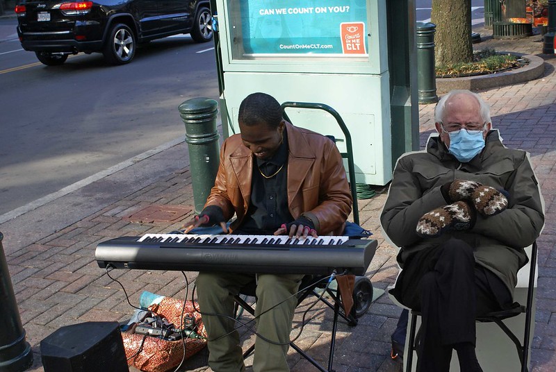 Joining the Bernie meme craze, we are sharing this photo of Bernie enjoying music in Uptown Charlotte. I thought it was very cool that Bernie put his meme photo on a tee-shirt and “100% of the proceeds go toward Meals on Wheels Vermont”.