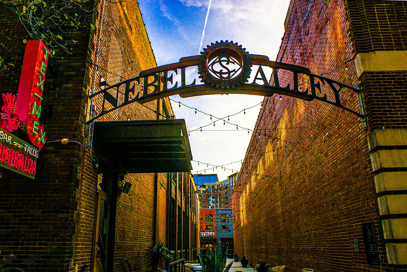 Today’s photo shows one of the restaurants in the Design District found in the South End near uptown Charlotte. Yesterday’s photo shows the water tower at the center of the Design District. Today’s photo shows Nebel Alley and a Tex Mex restaurant restaurant. Nebel Alley is named after the former Nebel Knitting Mill. Note that in addition to restaurants there are also events at Nebel Alley.