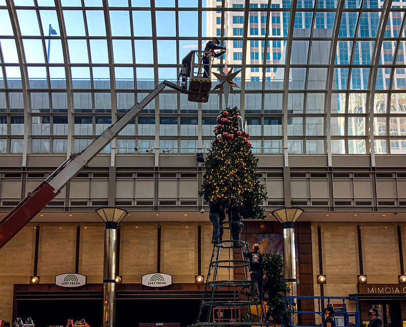 The day after Thanksgiving means putting up Christmas trees. Today’s photo shows the assembly of the Christmas tree in the atrium of One Wells Fargo Center. As you can see the assembly involves a crane and several people.