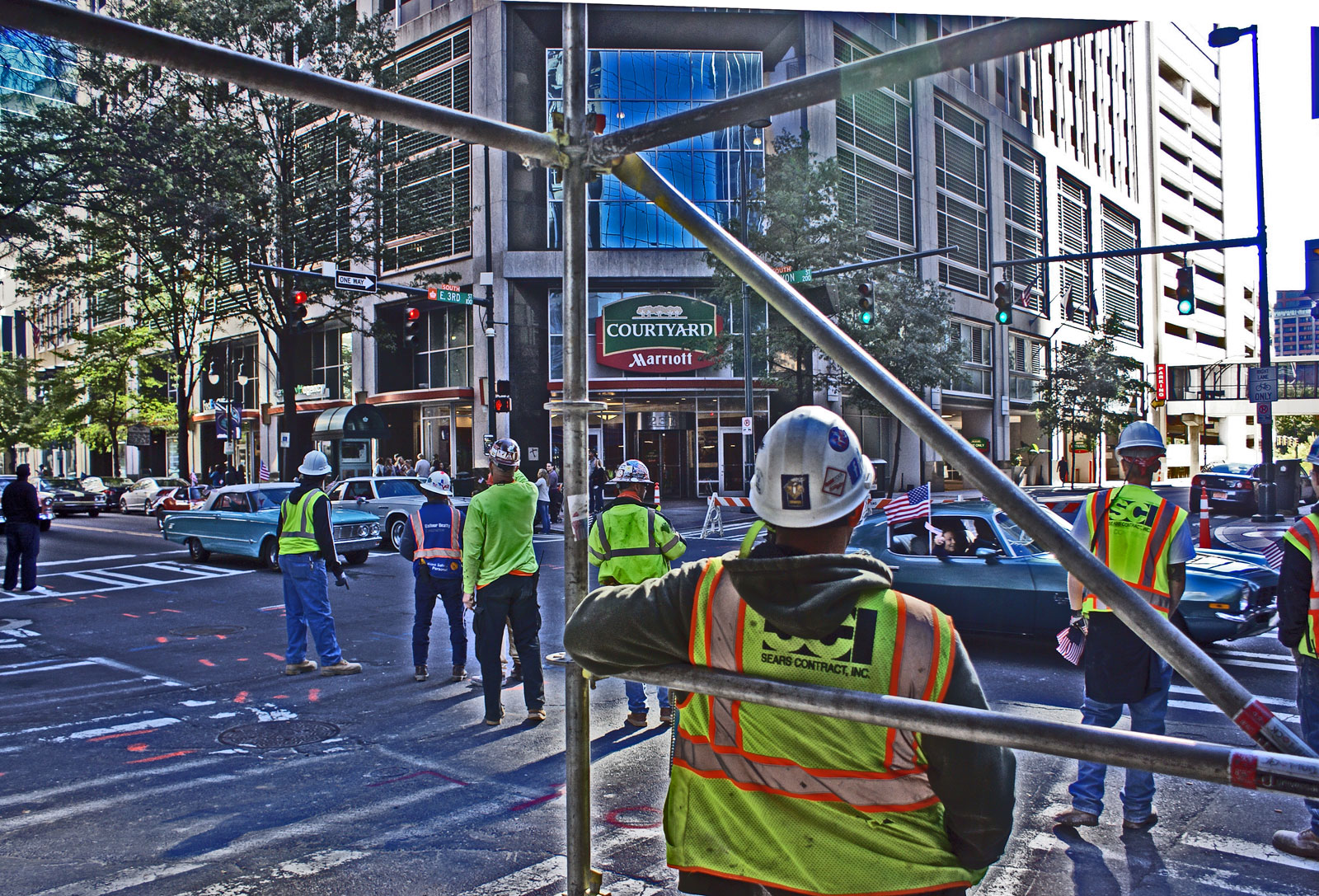These construction workers were enjoying the antique cars which participated in the Veterans Day Parade.