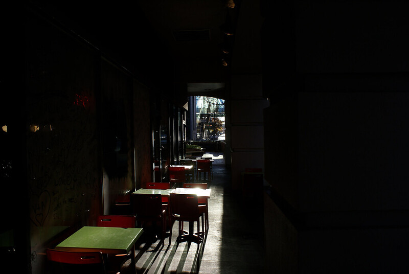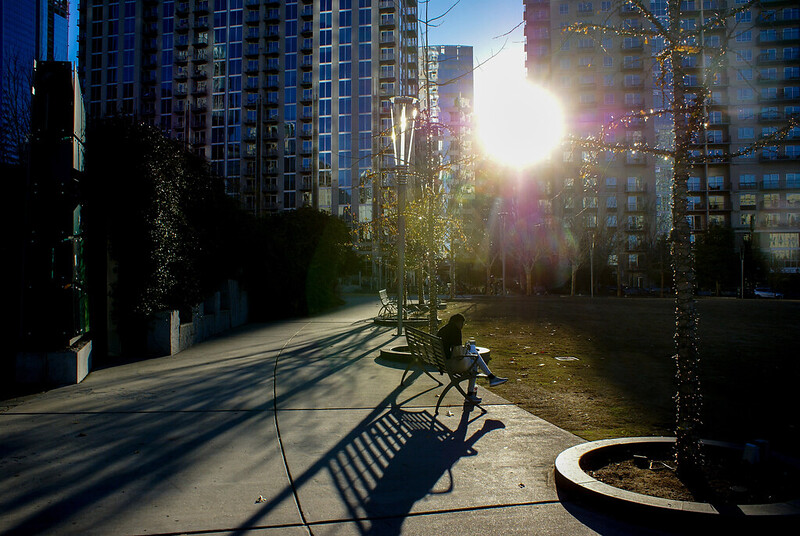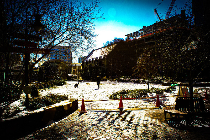 A block of seesaws at the the Impulse exhibit as part of the Shout festival in uptown Charlotte. The seesaws are a hit and much enjoyed by the young and the old. The website, for Impulse exhibit, explains that “an interactive work comprising a series of 15 seesaws with light and sound that changes when in motion”.