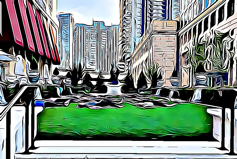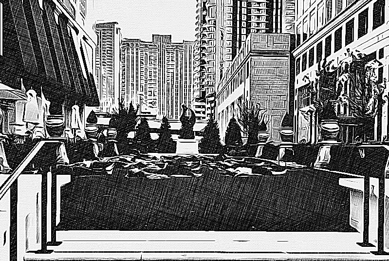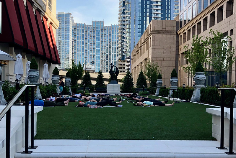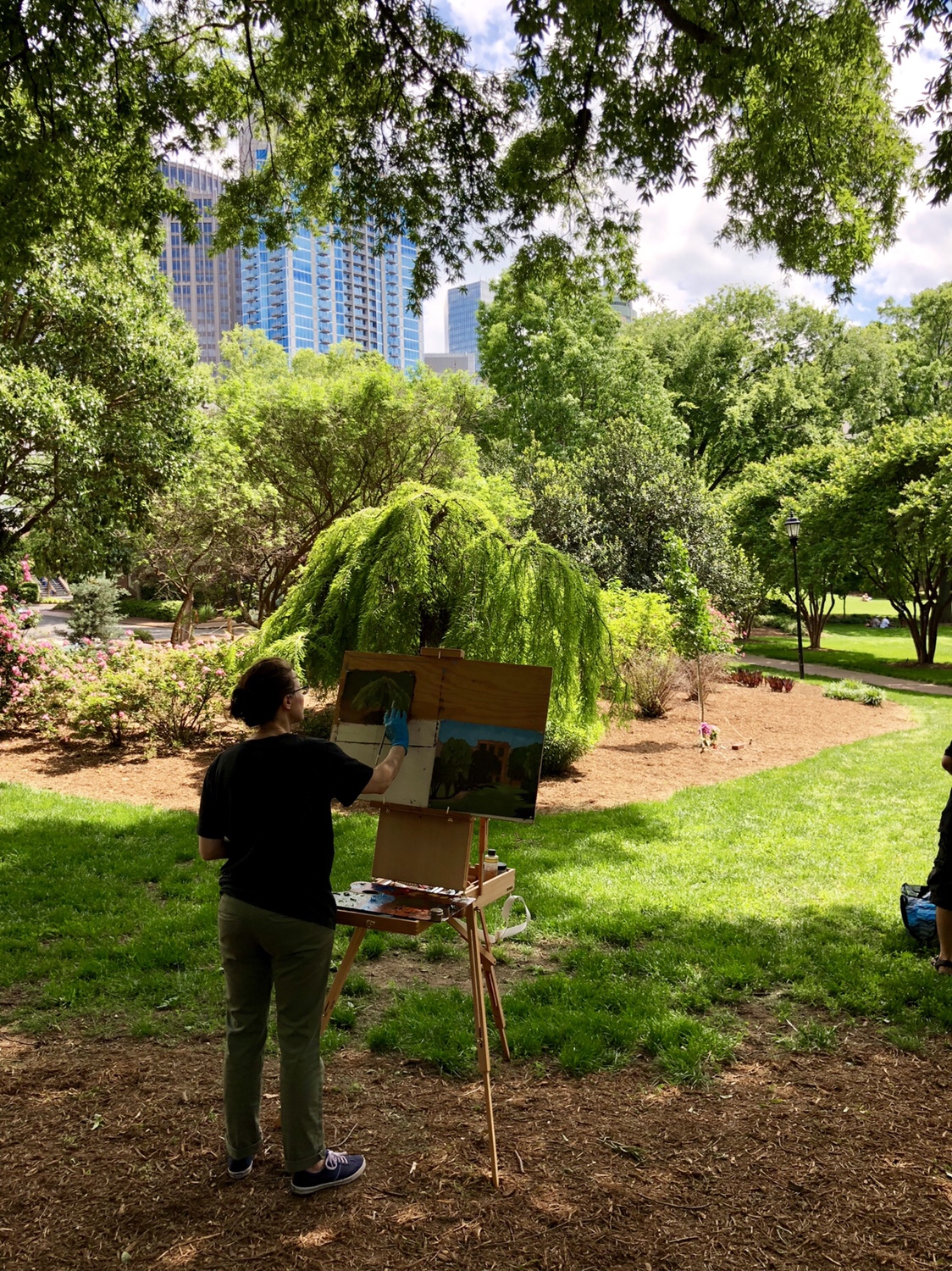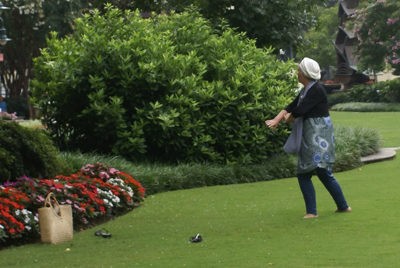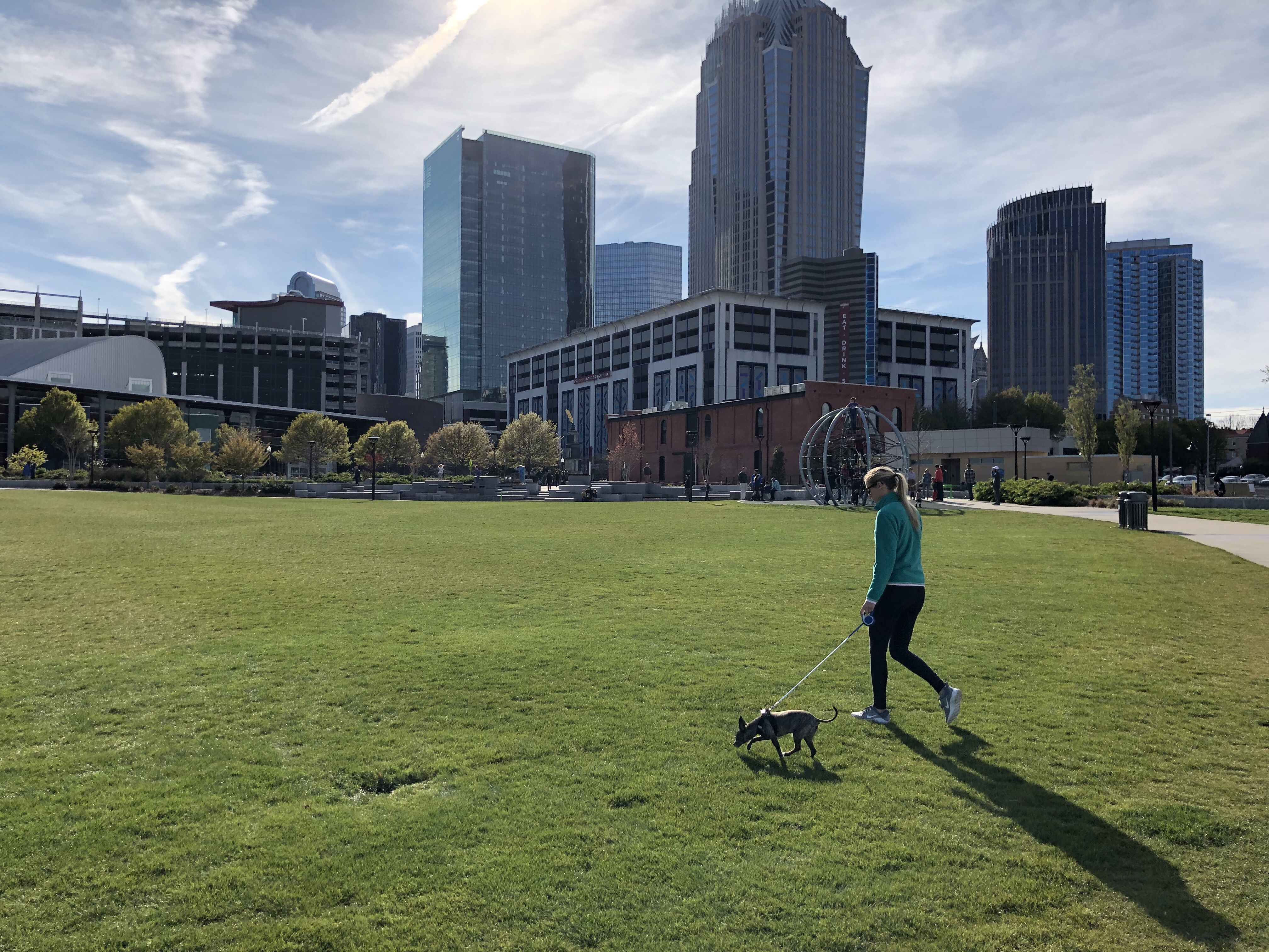 Even in the snow you have to walk the dog. This photo was taken at the Green park in uptown Charlotte. The photo was taken facing the sun and as a result we have a large lens flare in the center of the photo. Personally I like the lens flare and the shadows.