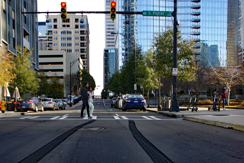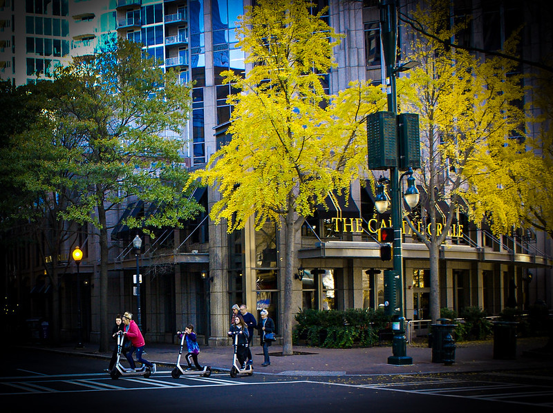 Today’s photo shows a common scene in uptown Charlottes. Electric scooters are everywhere. From a personal perspective I would prefer a few less scooters and a lot more observance of the rules. But at the same time I enjoy the smiles on the faces.