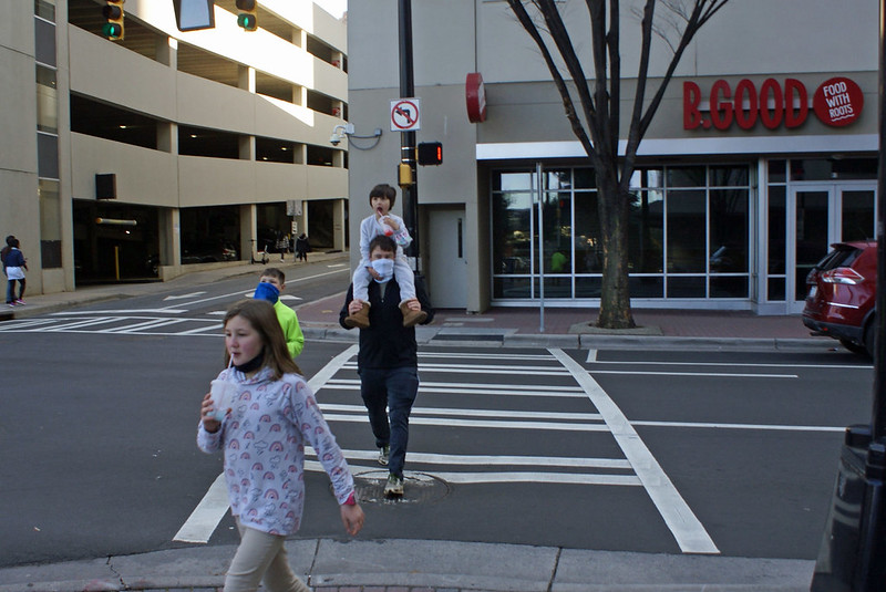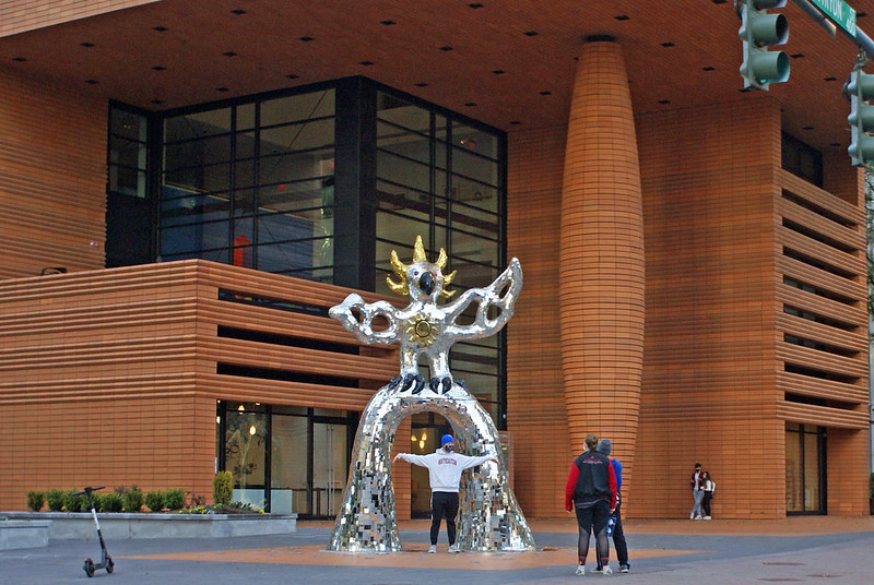 Life goes on and people are still enjoying Uptown Charlotte. As shown in today’s photo; people are posing for photos at popular sites such that the Fire Bird in front of the Bechtler Museum of Modern Art. The Fire Bird is made from mirrors and is affectionately known as “Disco Chicken” by area residents.