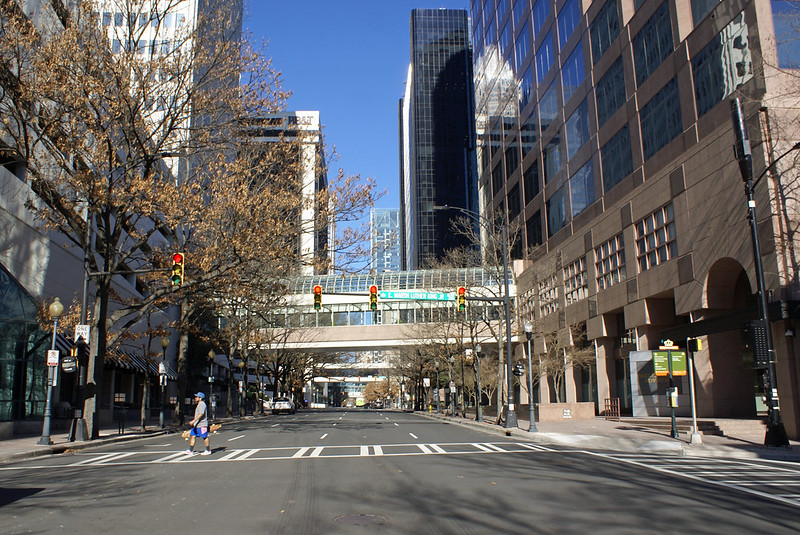 Today’s photo shows a common scene in Uptown Charlotte now that the weather is warmer. As shown, in today’s photo; people are wearing shorts, the streets are empty, and skateboarders are enjoying themselves.