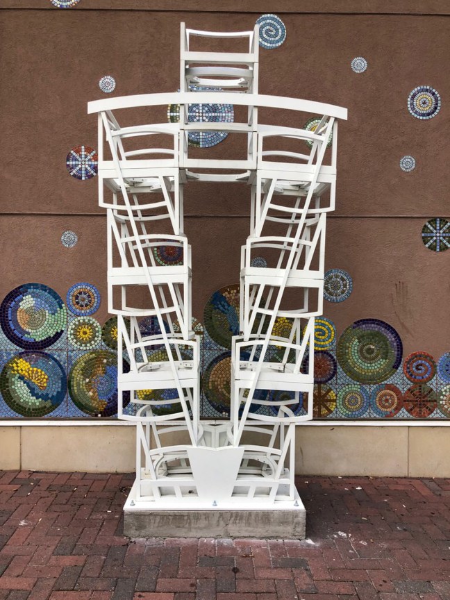 When strolling in Uptown one finds unique art such as these chairs near ImaginOn. Unfortunately no plaque or signature was found.