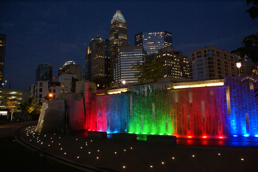 On an evening stroll I took this photo of the waterfalls at Romare Bearden Park. The lights are a nice touch.