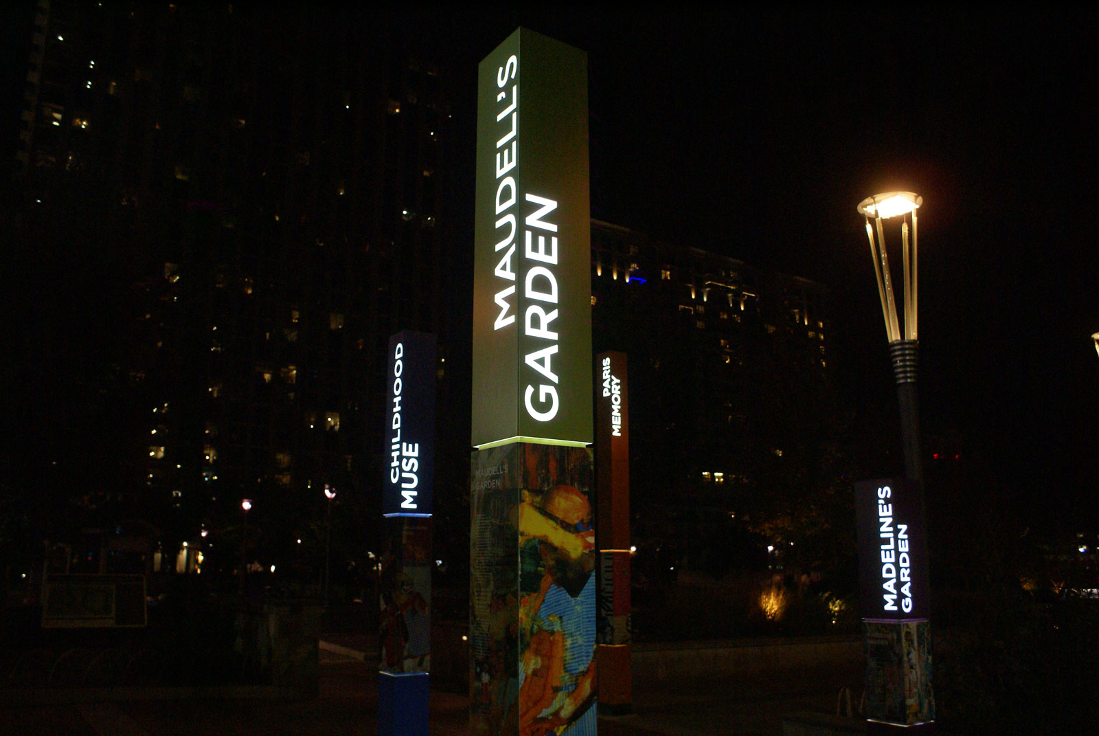 The sign post for Maudell’s garden is highlighted in today’s photo. To the right please notice the sign for Madeline’s garden. The gardens are named after Romare Bearden’s Grandmother and Mother.